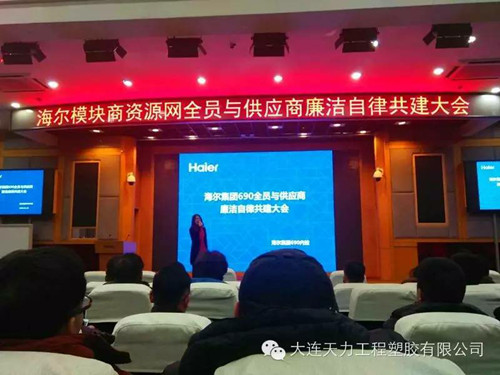 2016年1月9日,上午10时天力公司代表张辉、张伟参加了海尔空调质量创客发布大会及海尔供应商廉洁自律大会,大会在大连及青岛同时举行。