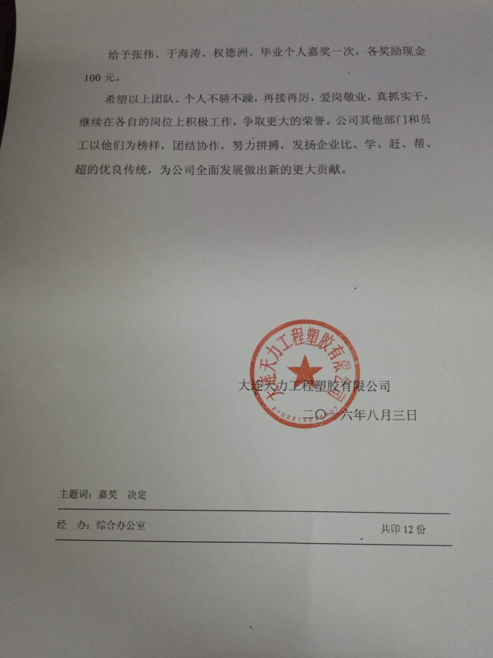 希望以上团队、个人不骄不躁,再接再厉,爱岗敬业,真抓实干,继续在各自的岗位上积极工作,争取更大的荣誉。 公司其他部门和员工以他们为榜样,努力拼搏,发扬企业比、学、赶、帮、超的优良传统,为公司全面发展做出新的更大贡献。