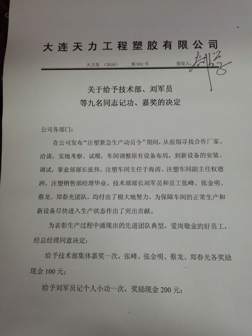 在公司发布“注塑紧急生产动员令”期间,从前期寻找合作厂家、洽谈,实地考察、试模,车间调整原有设备布局,到新设备的安装、调试,事业部部长张伟、注塑车间主任于海涛、注塑车间副主任权德洲、注塑销售部经理毕业、技术部部长刘军员和员工张峰、张金明、蔡龙、郑春光团队,均付出了极大地努力,为保障车间的正常生产和新设备尽快进入生产状态作出了突出贡献。