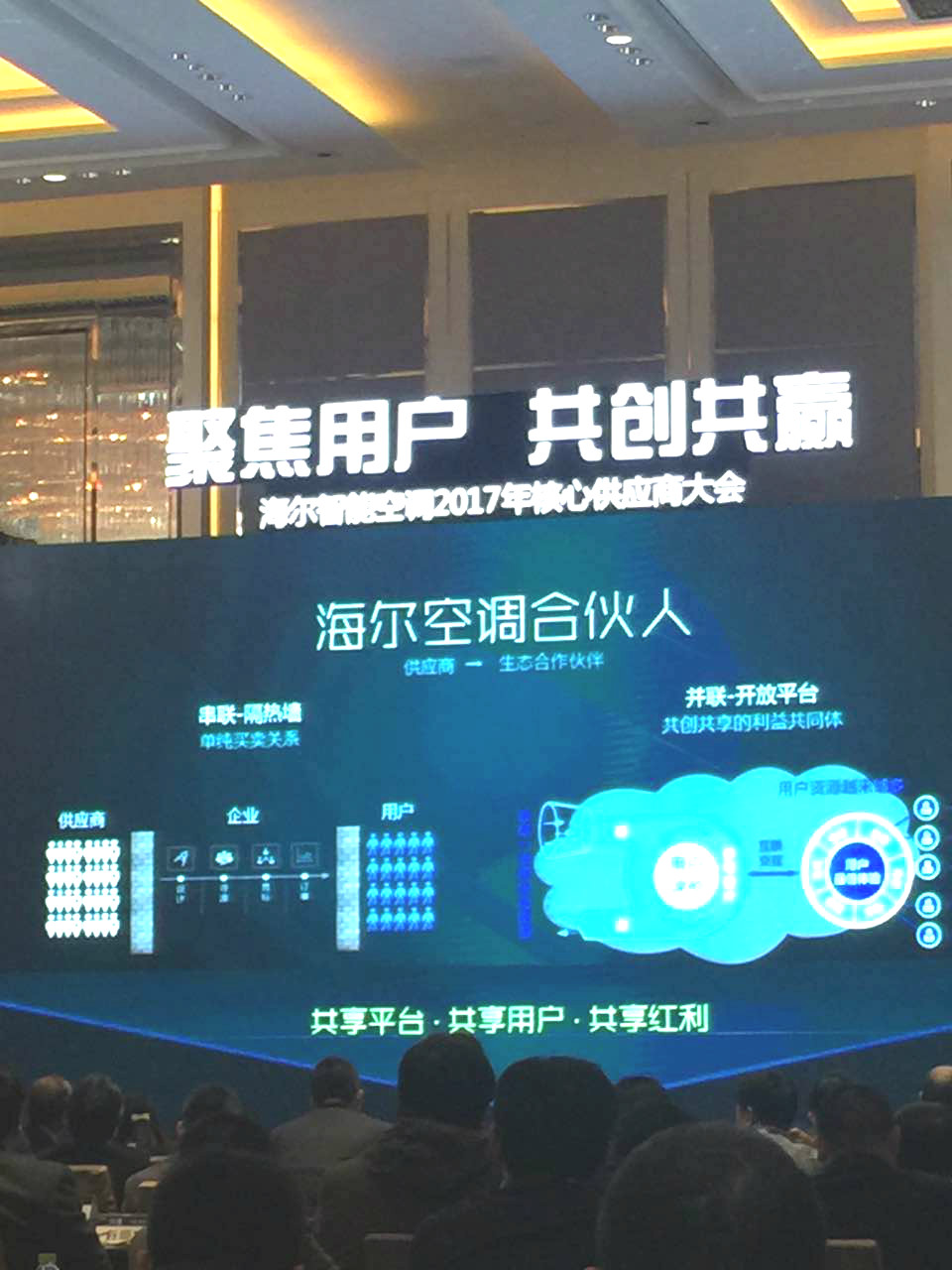 会上,海尔副总裁王永林介绍了海尔空调作为全球空调行业的创新引领者,其产业布局和采购策略,提出2017元年产值要实现100%增长的目标,期待供应商与海尔空调深度合作,实现提建议、给方案、配资源、做分享的协同发展模式,“聚焦用户、共创共赢”。