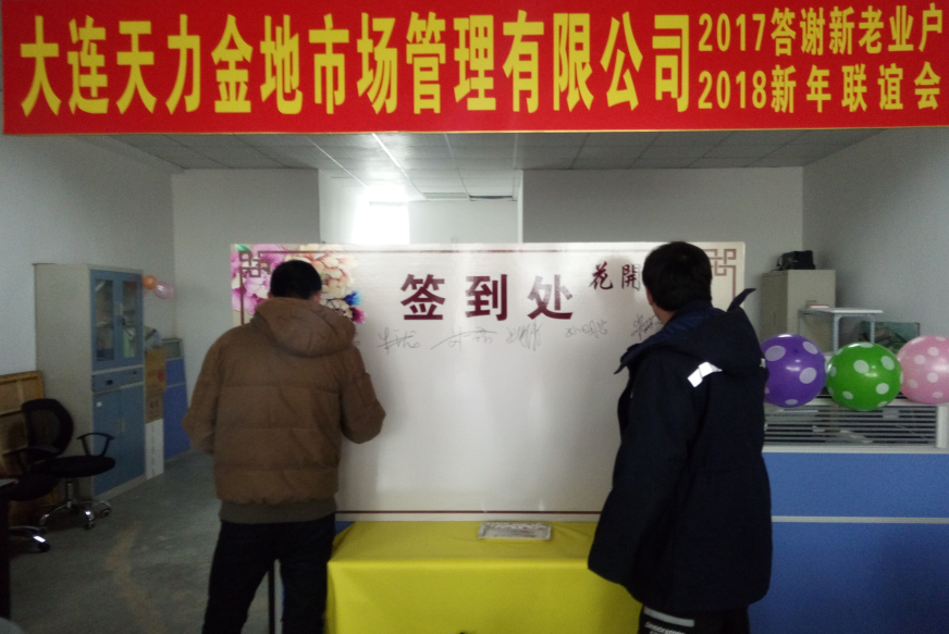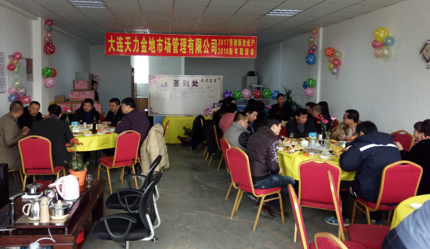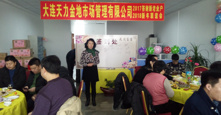 2017年12月29日,大连天力金地市场“2017答谢新老业户 2018新年联谊会”在金地市场营销中心隆重举行。在这难得的暖冬天气里,近40家业户共聚一堂,现场欢声笑语、其乐融融。