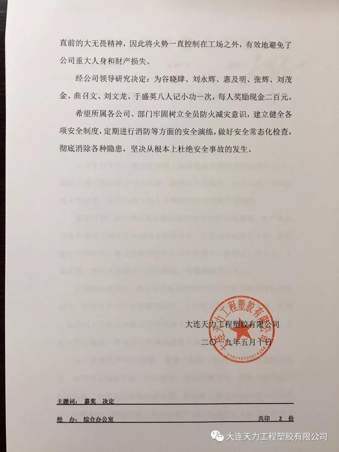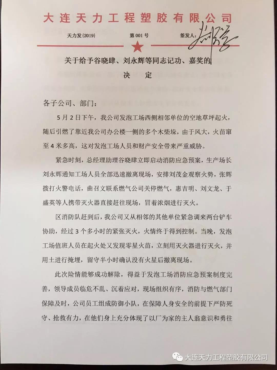 5月10日,天力董事长谷顺学带领办公室主任刘晓霞、宣传部长杨有磊、销售经理李祎楠来到发泡工场,看望在“5.2邻厂失火”排除险情过程中表现突出的八名同志,分别为谷晓肆、刘永辉、刘茂金、张辉、曲召文、惠吉明、刘文龙、于盛英记小功一次,并给予嘉奖。