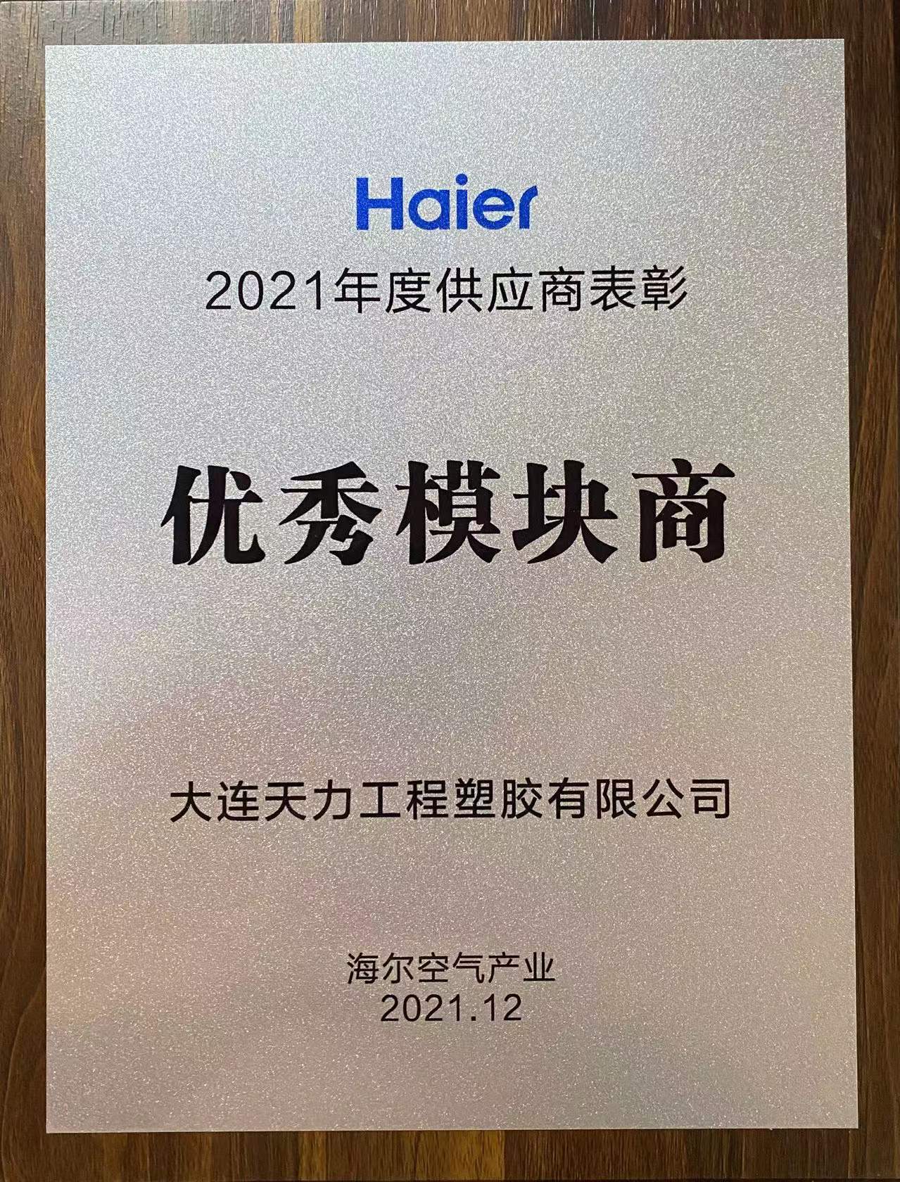 近日,大连天力作为“核心供应商”和“特别贡献奖单位”,在本年度以优异的表现又一次获得了海尔的肯定,被海尔空气产业授予“2021年度优秀模块商”称号。大连天力将再接再厉,以生产稳定、质量合格、保障有力的实际行动和优秀表现,继续为海尔的发展、壮大贡献新的力量!